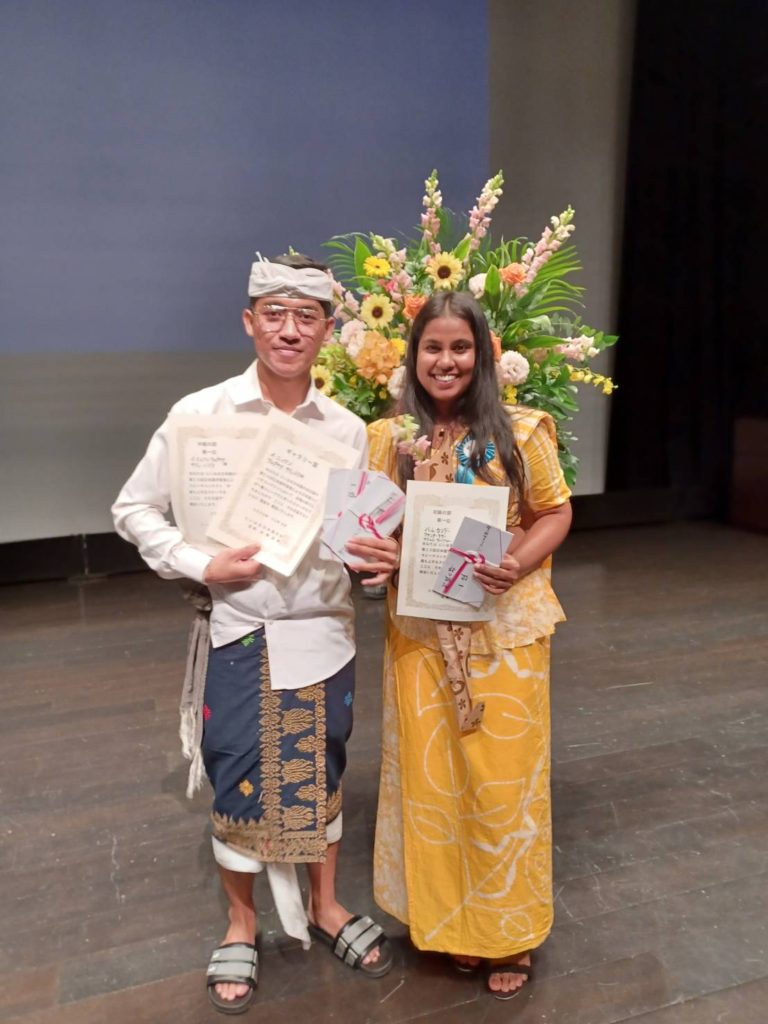 わたしたちの学校からは、「初級」レベルに1年生のウペクシャーさん(スリランカ)、「中級」レベルにヤナさん(インドネシア)が民族衣装(みんぞくいしょう)をまとって出場しました。審査結果は、なんと!ウペクシャーさんは「初級」レベルで1位獲得(かくとく)。ヤナさんは「中級」レベルで1位獲得。そしてギャラリー(かんきゃく)賞までいただきました。私たちはとってもとっても鼻が高いですねぇ。(「鼻が高い」意味を調べてくださいね。JLPTに出るかもですよぉ)