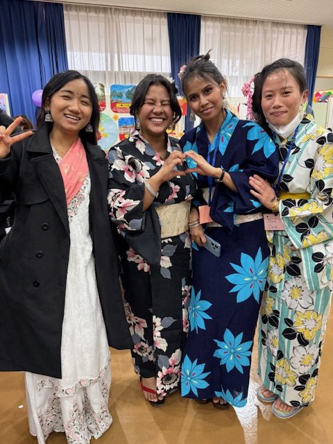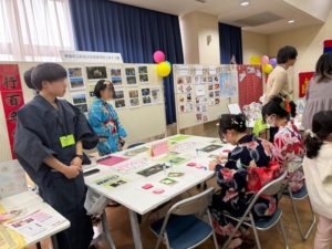 ステージ以外(いがい)では、いろいろな国(くに)のブース、体験(たいけん)ブース、高校生(こうこうせい)専門学生(せんもんがくせい)ブースなどがありました。学生たちは体験ブースで浴衣(ゆかた)を着(き)せていただいた学生もいました。